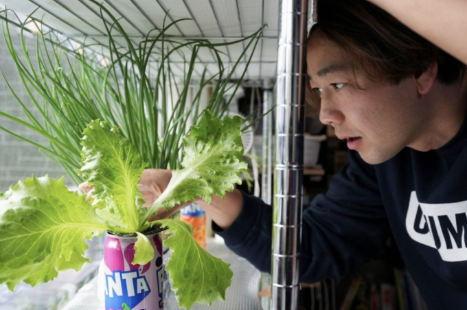 Anh đã bỏ công việc ở cửa hàng điện tử để trồng rau trong nhà,bao gồm lá shiso,hành tây,củ cải trong các chai nhựa,lon bia và thậm chí là giỏ xe đạp.