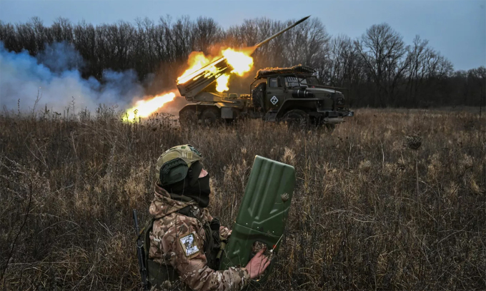 Pháo phản lực BM-21 Grad Nga khai hỏa trên mặt trận ở tỉnh Donetsk tháng 12/2024. Ảnh: BQP Nga