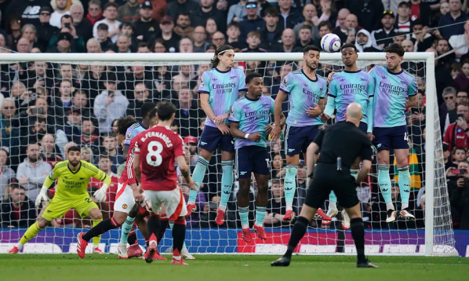Bruno Fernandes đá phạt mở tỷ số trong trận Man Utd hòa Arsenal 1-1 trên sân Old Trafford,Manchester,Anh ngày 9/3. Ảnh: PA