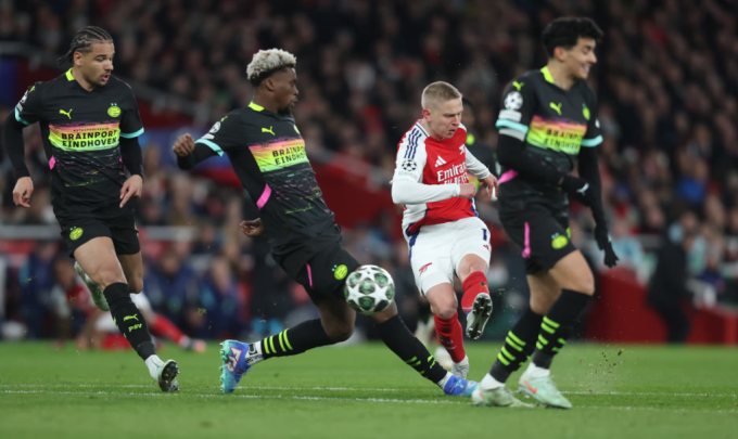 Oleksandr Zinchenko cứa lòng mở tỷ số trong trận Arsenal hòa PSV 2-2 trên sân Emirates,Anh ngày 12/3. Ảnh: CameraSport