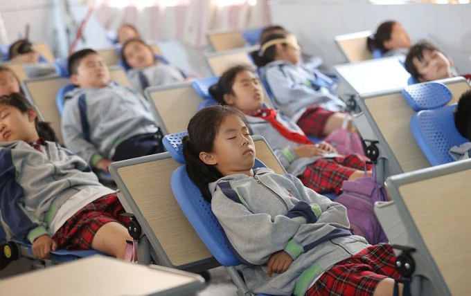Học sinh một trường ở tỉnh Chiết Giang,Trung Quốc,ngủ trưa tại lớp,trước khi bắt đầu giờ học buổi chiều năm 2022. Ảnh: CFP