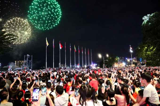 Đông nghịt người xem pháo hoa trước cột cờ ASEAN - bến Bạch Đằng,tối 26/4. Ảnh: Đình Văn