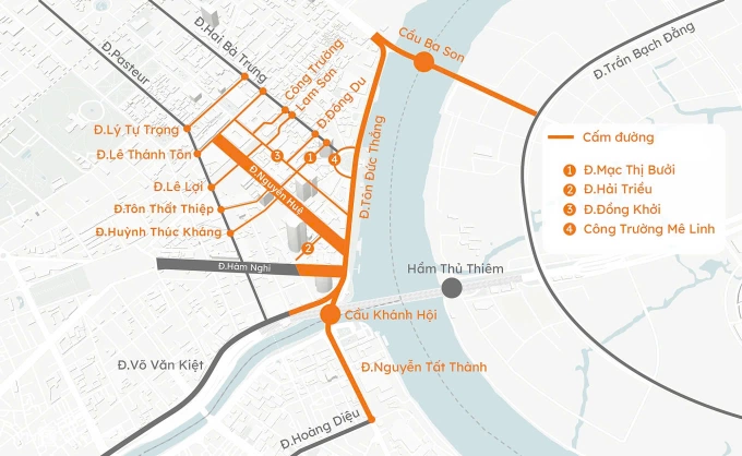 Để đảm bảo an toàn,phục vụ người dân vui chơi trong thời gian tổ chức sự kiện,Phòng CSGT TP HCM (PC08) thông báo xe bị cấm vào hơn 20 đường khu trung tâm,từ 18h đến 22h,gồm: Lê Lợi (từ Pasteur đến Đồng Khởi),Nguyễn Huệ (Lê Thánh Tôn đến Tôn Đức Thắng),Đồng Khởi (Mạc Thị Bưởi đến Tôn Đức Thắng),Tôn Đức Thắng (Nguyễn Siêu đến cầu Khánh Hội).