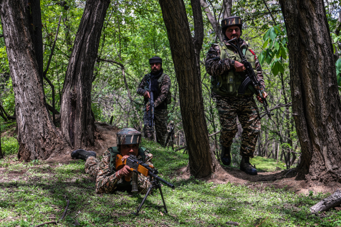 Binh sĩ Ấn Độ truy lùng các tay súng thực hiện vụ xả súng làm 26 người chết trong khu rừng thuộc vùng Jammu và Kashmir,miền bắc Ấn Độ ngày 26/4. Ảnh: AFP