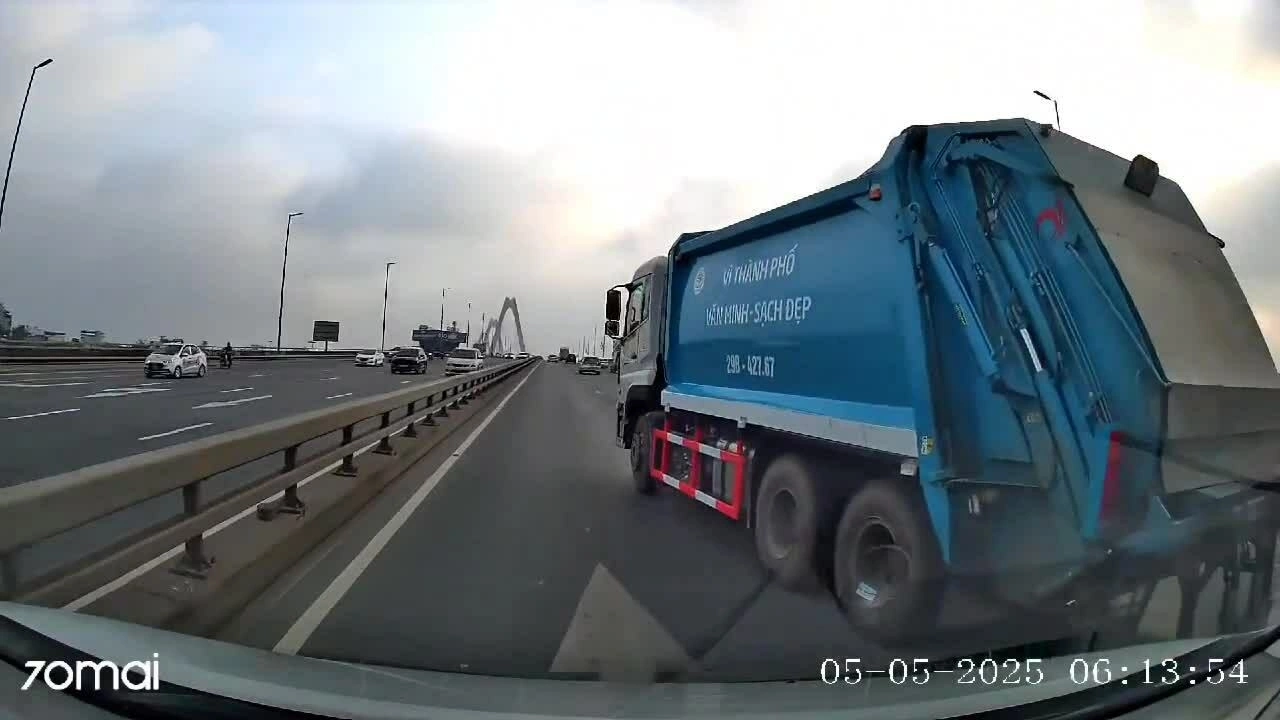 Tình huống giao thông: Từ lối vào,không tín hiệu xi-nhan,không có dấu hiệu giảm tốc,chiếc xe tải vệ sinh môi trường băng liền qua ba làn đường để nhập làn. Lái xe có gắn camera hành trình đang đi ở làn đường sát dải phân cách buộc phải phanh dừng lại để nhường đường.