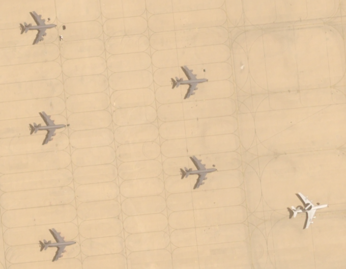 Máy bay E-3 và 5 phi cơ tiếp dầu đậu ngoài trời ở căn cứ Prince Sultan hôm 29/3. Ảnh: Airbus