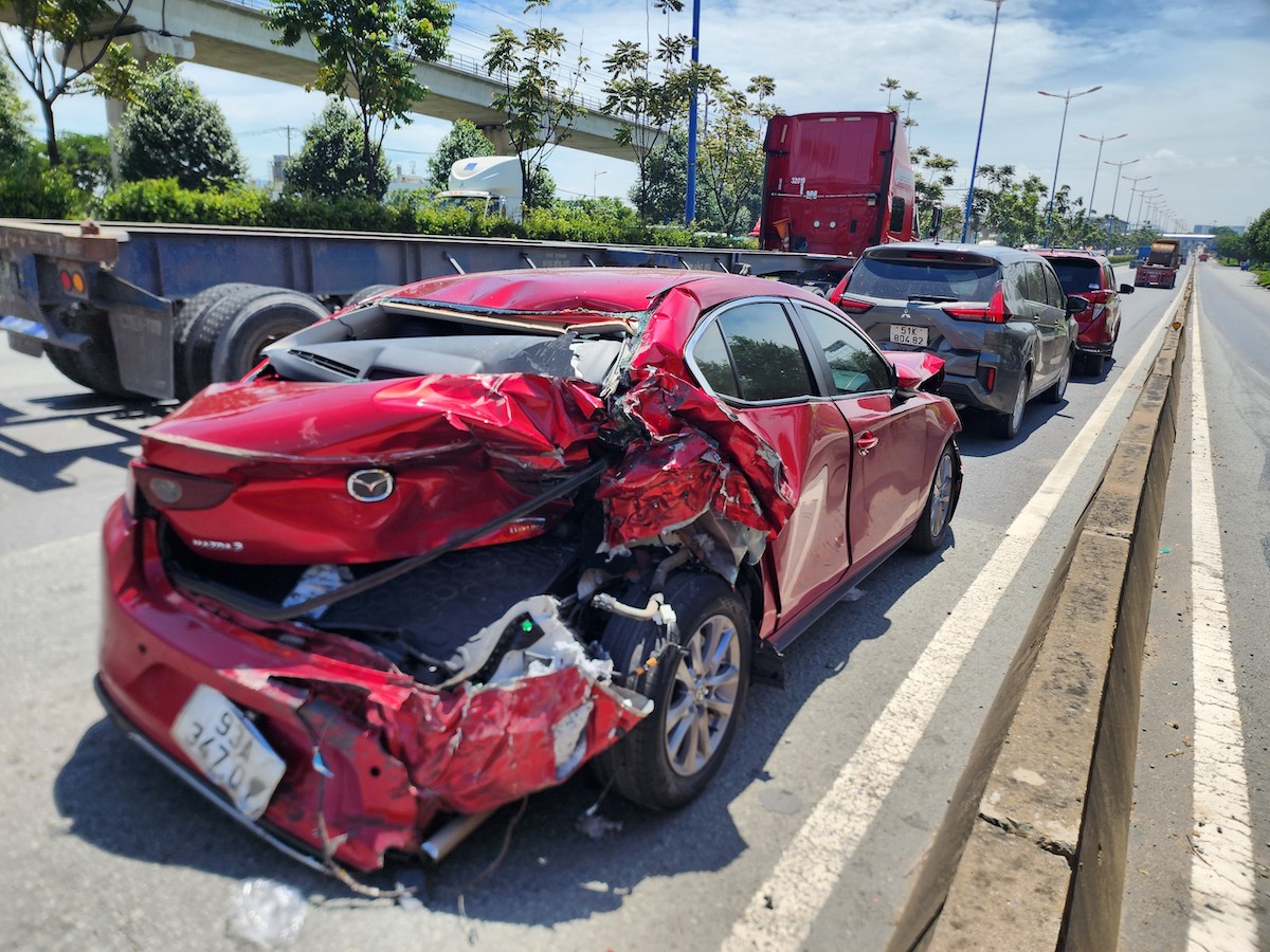 Các xe hư hỏng sau tai nạn liên hoàn nằm chắn ngang làn đường xa lộ Hà Nội. Ảnh: Đình Văn
