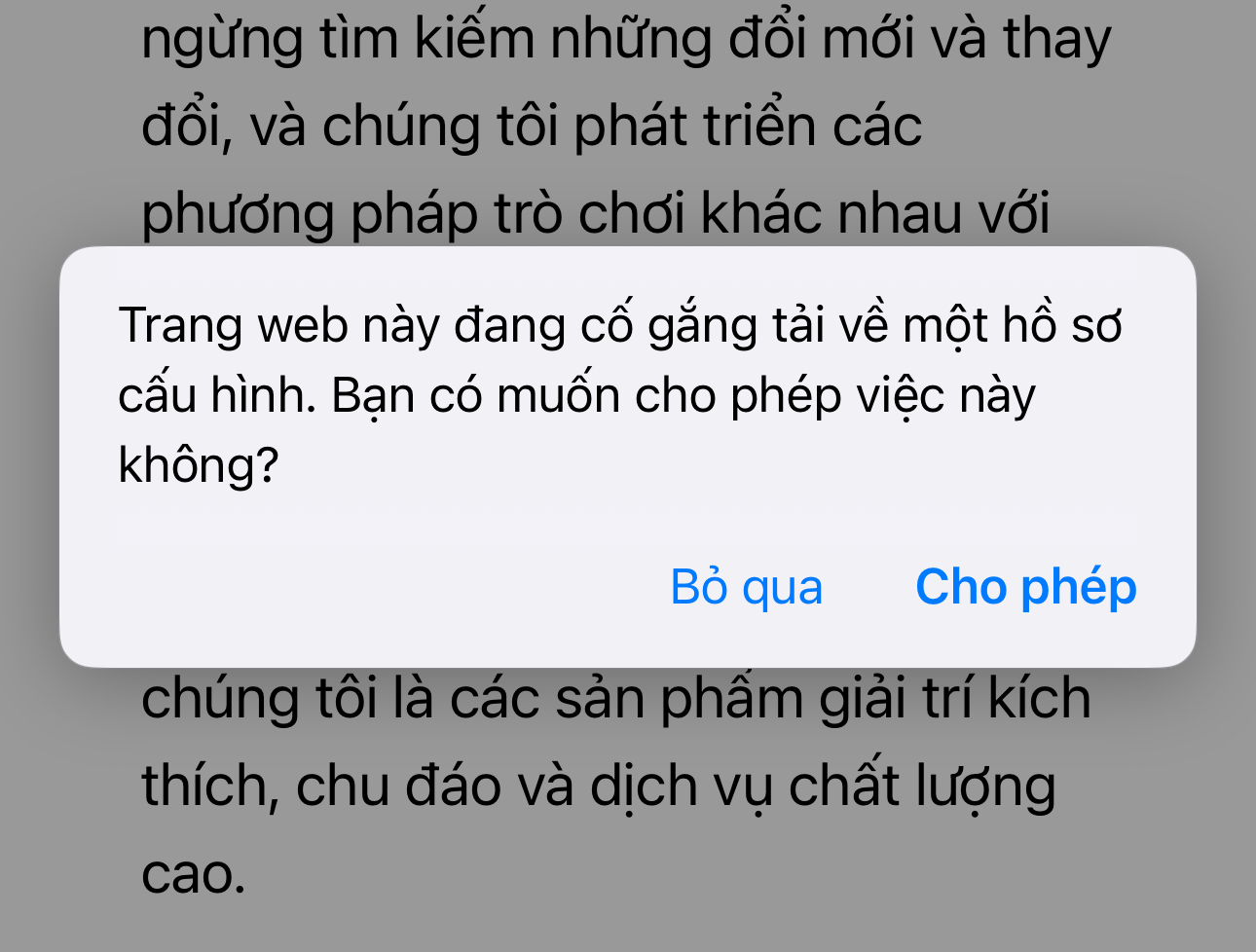 Trang web yêu cầu người dùng tải hồ sơ cấu hình để cài phần mềm,tiềm ẩn nguy cơ bị chiếm quyền điều khiển thiết bị. Ảnh chụp màn hình
