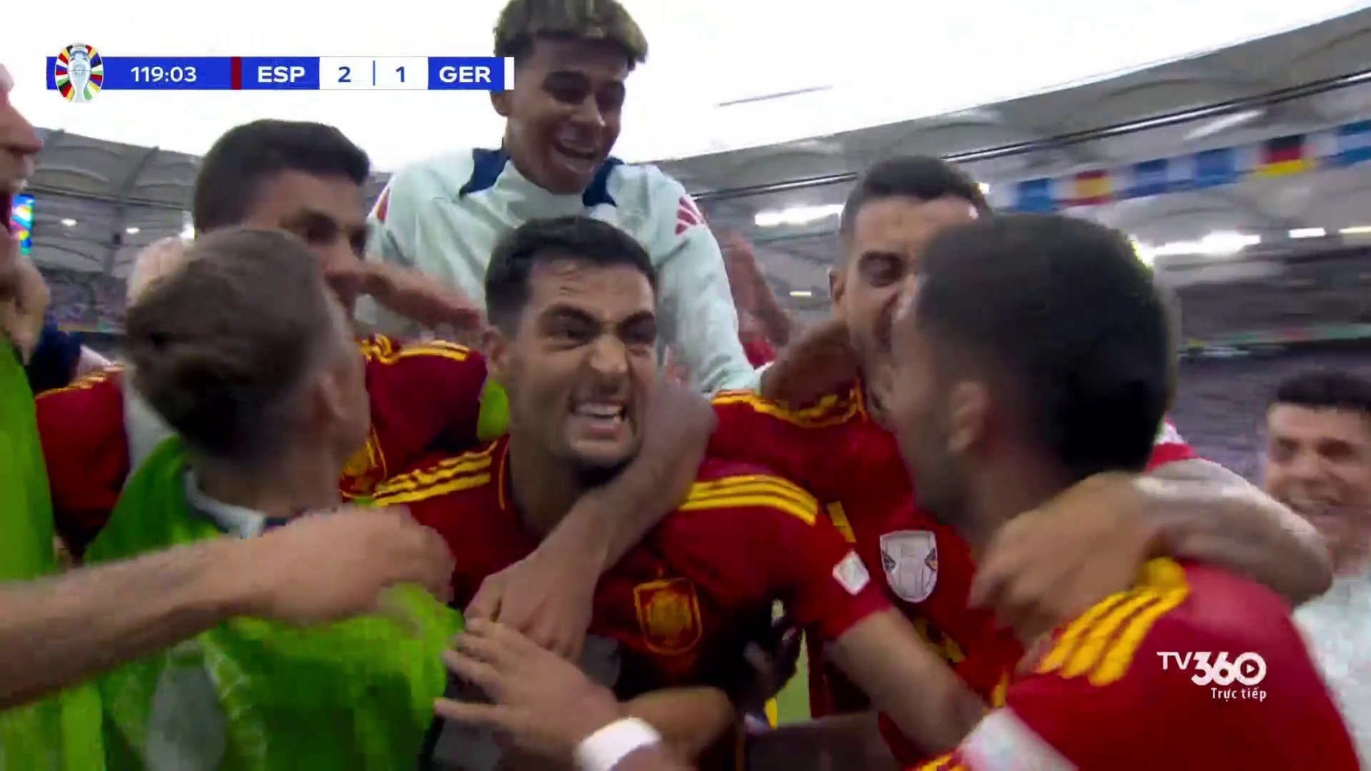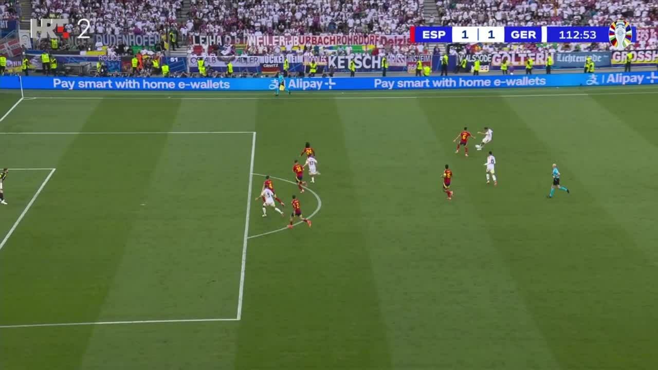Trong trận tứ kết,Tây Ban Nha dẫn từ phút 55,nhờ cú sút chìm trong vòng cấm của Dani Olmo. Nhưng đến phút 89,Florian Wirtz vô lê gỡ hòa cho Đức,buộc đội khách phải đá thêm hai hiệp phụ. Đức dứt điểm thêm nhiều lần,nhưng không thành. Đến phút 119,Mikel Merino đánh đầu đem lại chiến thắng 2-1 cho Tây Ban Nha.