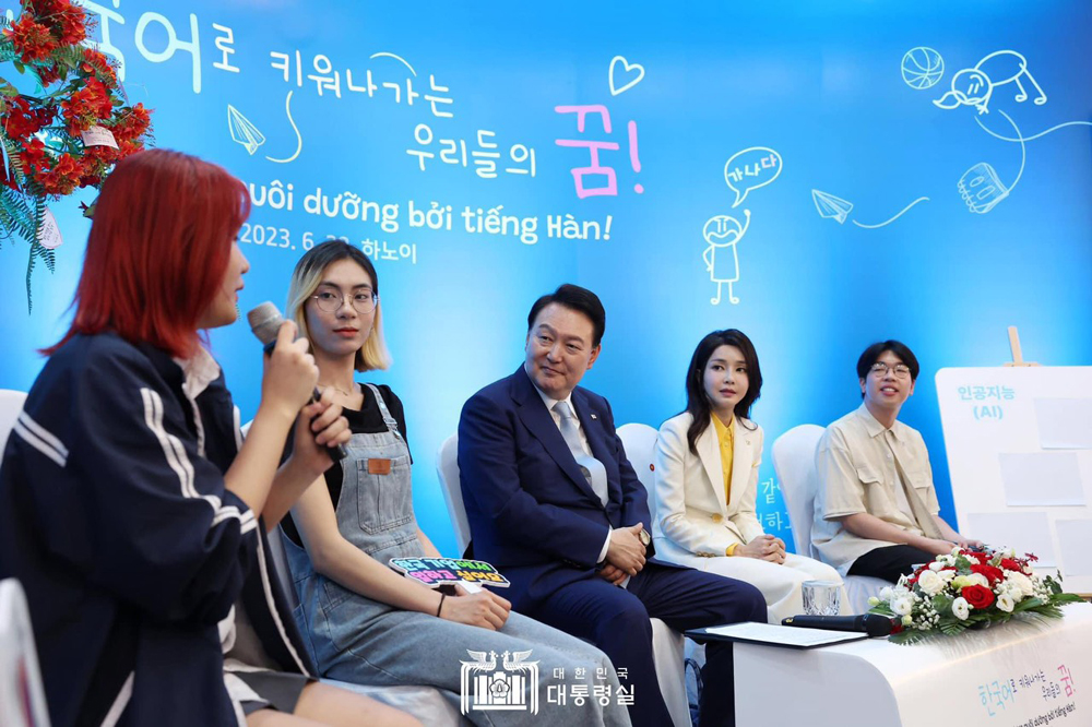 Tổng thống Hàn Quốc Yoon Suk Yeol và phu nhân giao lưu với sinh viên khoa tiếng Hàn,trường Đại học Ngoại ngữ,trong chuyến thăm Đại học Quốc gia Hà Nội tháng 6/2023. Ảnh: Văn phòng Tổng thống Hàn Quốc