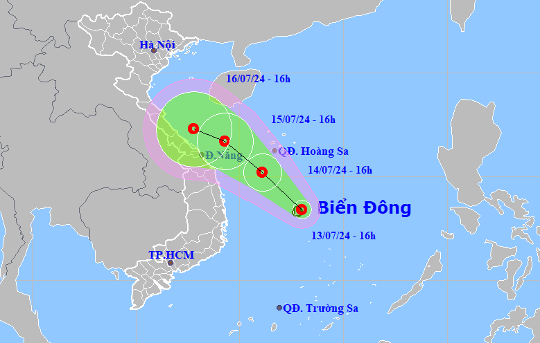 Đến 16h ngày mai,áp thấp nhiệt đới ở trên vùng biển tây nam quần đảo Hoàng Sa,sức gió cấp 6-7,đi hướng tây bắc với tốc độ 10 km/h. Đến 16h ngày 15/7,nó sẽ ở ngoài khơi các tỉnh Quảng Bình - Quảng Ngãi,mạnh cấp 7,giật tăng hai cấp.