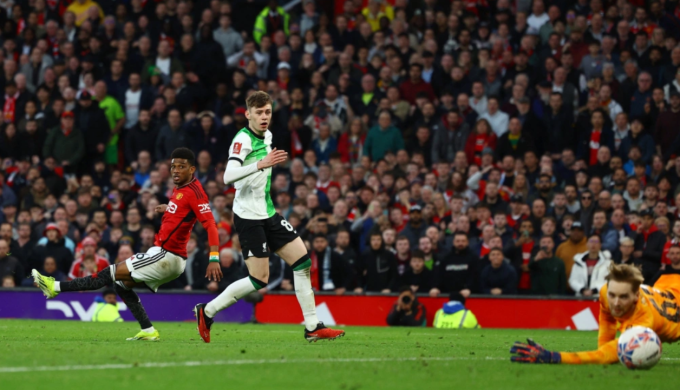 Amad Diallo ghi bàn ấn định thắng lợi 4-3 cho Man Utd trước Liverpool ở tứ kết Cup FA trên sân Old Trafford ngày 17/3/2024. Ảnh: Reuters