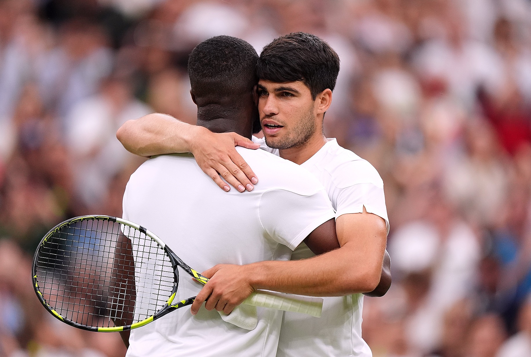 Alcaraz (phải) ôm động viên Tiafoe sau trận đấu trên sân Trung tâm Wimbledon,hôm 5/7. Ảnh: Reuters