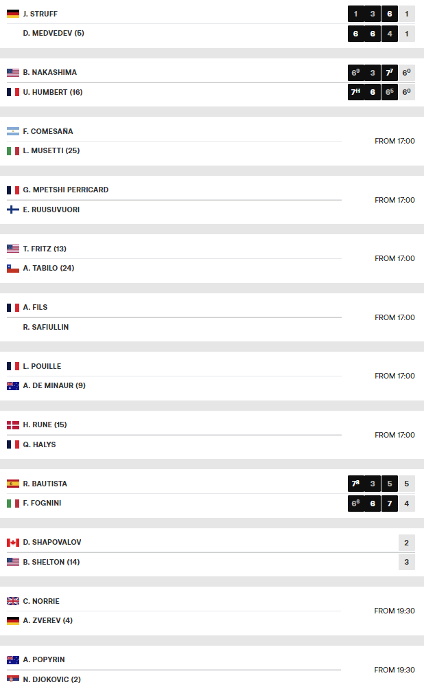 Alcaraz đã có 10 trận thắng liên tiếp ở Wimbledon. Tại vòng bốn,anh gặp Ugo Humbert hoặc Brandon Nakashima. Cùng đi tiếp với Alcaraz còn có Jannik Sinner và Grigor Dimitrov,những người hạ Miomir Kecmanovic và Gael Monfils sau ba set. Nhiều trận vòng ba khác chưa thể diễn ra hoặc hoàn thành,do trời mưa.