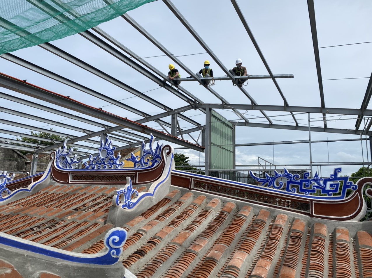 Phần giàn giáo che chắn công trình được tháo dỡ,sáng 19/7. Ảnh: Trung tâm quản lý bảo tồn di sản văn hóa Hội An.