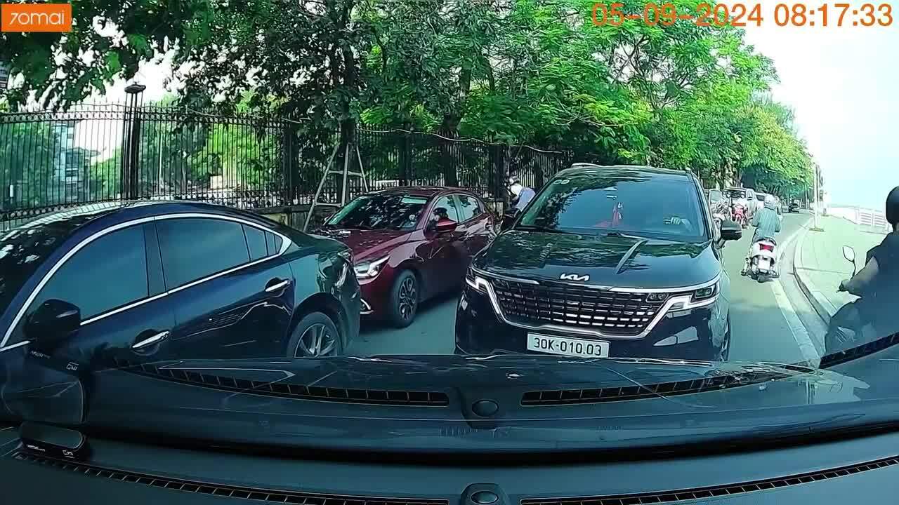 Tình huống giao thông: Trong khi các xe khác xếp hàng dài dừng chờ do phía trước ùn tắc thì một chiếc SUV lấn sang làn đường ngược chiều để vượt lên. Chiếc xe lấn làn chiếm toàn bộ phần đường còn lại cản lối xe có gắn camera hành trình ở hướng đúng chiều.