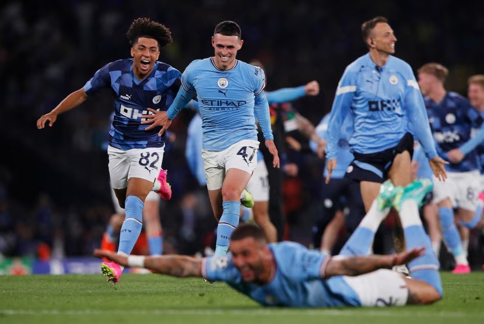 Rico Lewis,Phil Foden,Kyle Walker ăn mừng sau khi cùng Man City vô địch Champions League trên sân Ataturk,Istanbul,Thổ Nhĩ Kỳ ngày 10/6/2023. Ảnh: Reuters