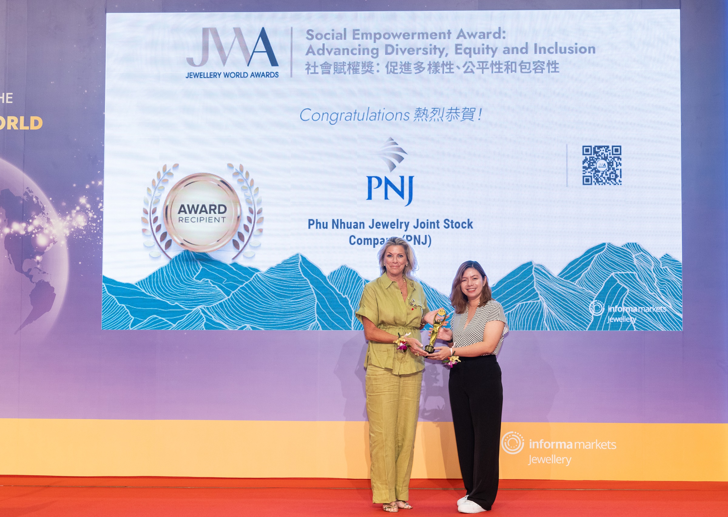 Doanh nghiệp bán lẻ trang sức Việt Nam vượt qua hàng trăm ứng viên sáng giá toàn cầu nhận giải "Social Empowerment". Trên website,ban tổ chức JWA nhận định: "PNJ thể hiện rõ ràng cam kết xây dựng môi trường làm việc đa dạng,công bằng và hòa hợp. Không chỉ là 'đầu tàu' lĩnh vực bán lẻ Lifestyle tại Việt Nam,đơn vị còn tiên phong chiến lược CSR,với loạt sáng kiến tạo tác động tích cực cho cộng đồng".