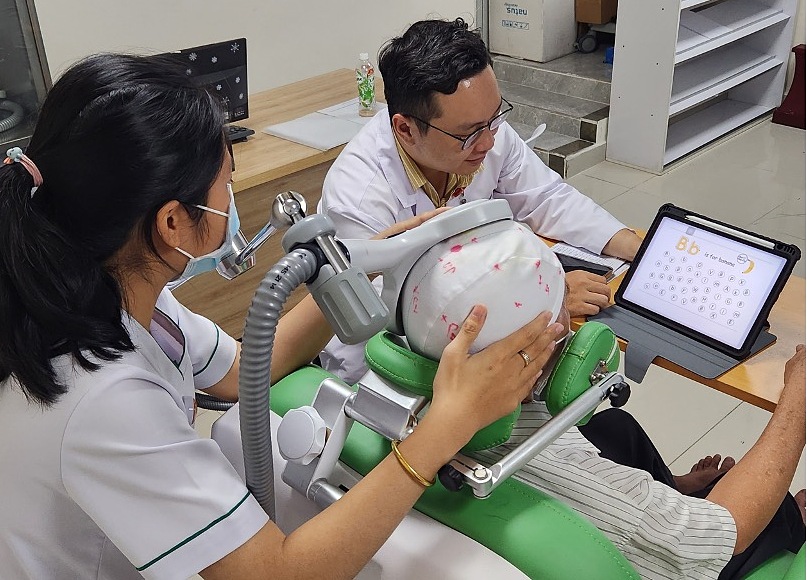 Tập nhận thức kết hợp kích thích não không xâm lấn tại Bệnh viện Quân y 175. Ảnh: Bệnh viện cung cấp