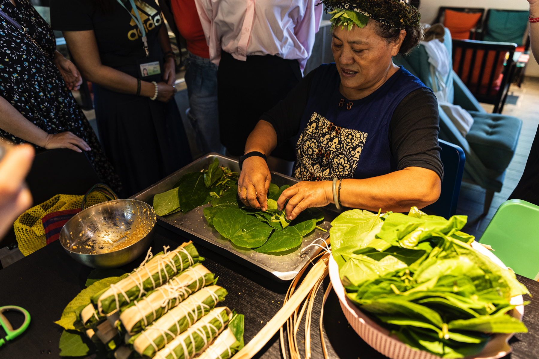Người Paiwan hướng dẫn khách làm bánh truyền thống của Đài Loan với nguyên liệu chính từ ốc sên,hạt kê,và bột nghiền từ khoai môn.