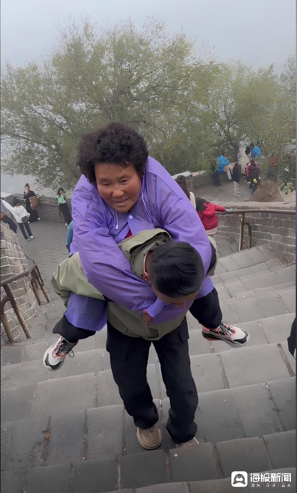 Tiểu Cương cõng mẹ lên Vạn Lý Trường Thành hôm 17/10. Ảnh: Dazhong Daily