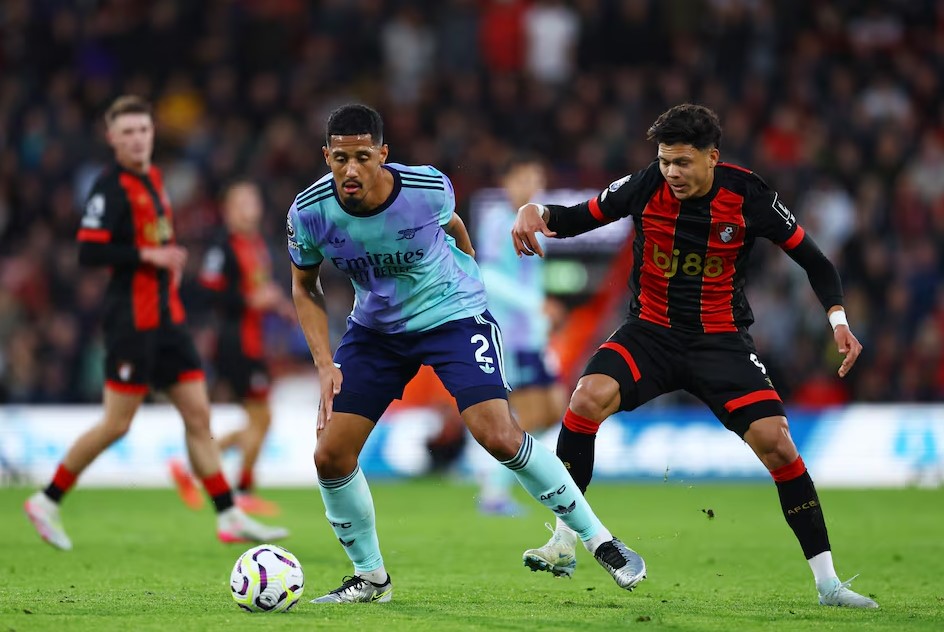 William Saliba (số 2) nhận thẻ đỏ trực tiếp trước Bournemouth và bị treo giò ở trận gặp Liverpool tại vòng 9 Ngoại hạng Anh ngày 27/10. Ảnh: Reuters.