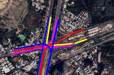 Hiện nay,tại nút giao này có bố trí đèn giao thông để phân luồng,tuy nhiên do mật độ xe quá lớn,xung đột nhiều luồng giao thông nên tình trạng ùn tắc vẫn thường xuyên xảy ra. Do đó theo tôi,giải pháp phân làn bằng đèn giao thông cho các luồng là chưa hiệu quả. Tôi đề xuất thử nghiệm giải pháp như sau: