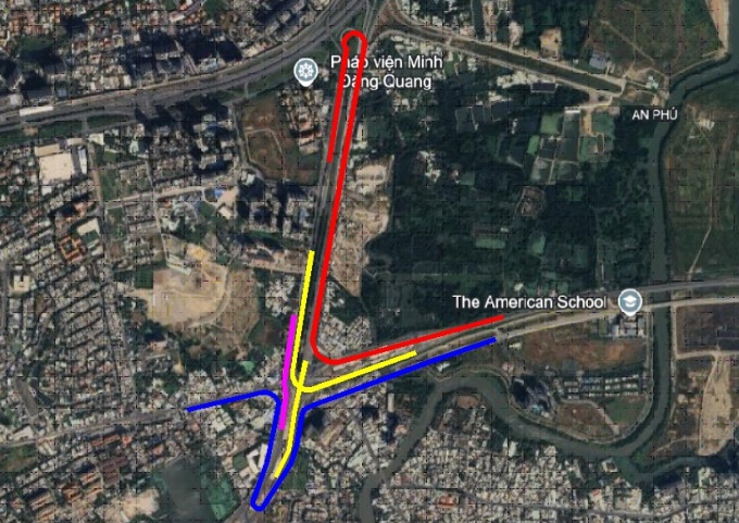 - Luồng xe từ đường Lương Định Của rẽ trái vào đường Mai Chí Thọ hoặc đi thẳng lên đường dẫn cao tốc (luồng màu tím).
