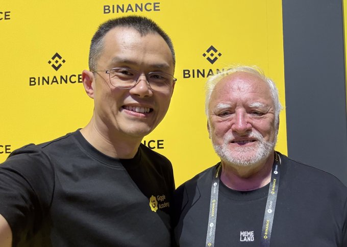 Bức hình CZ (trái) chụp cùng nhân vật trong ảnh meme nổi tiếng Hide the Pain Harold tại BBW 2024. Ảnh: X/CZ