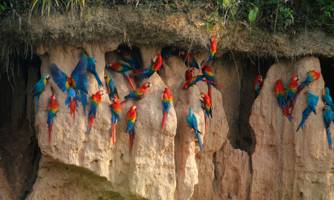 Vẹt tụ tập ở bãi đất sét trong khu bảo tồn quốc gia Tambopata,Peru. Ảnh: Salparadis