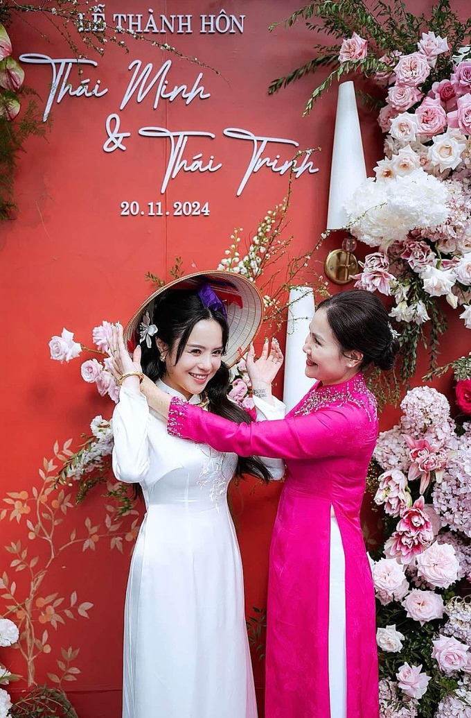 Mẹ chú rể - bà Minh Tâm - trao cho con dâu chiếc nón lá và nói: "Thái Trinh từ nay là thành viên mới của gia đình. Con dâu sẽ được mẹ chồng dạy bảo về hiếu nghĩa,tình anh em,bổn phận dâu thảo vợ hiền,nền nếp gia đình. Con sẽ được che chở trong tình yêu thương của bạn đời,đỡ đần mẹ trong việc chăm lo cho cuộc sống gia đình".
