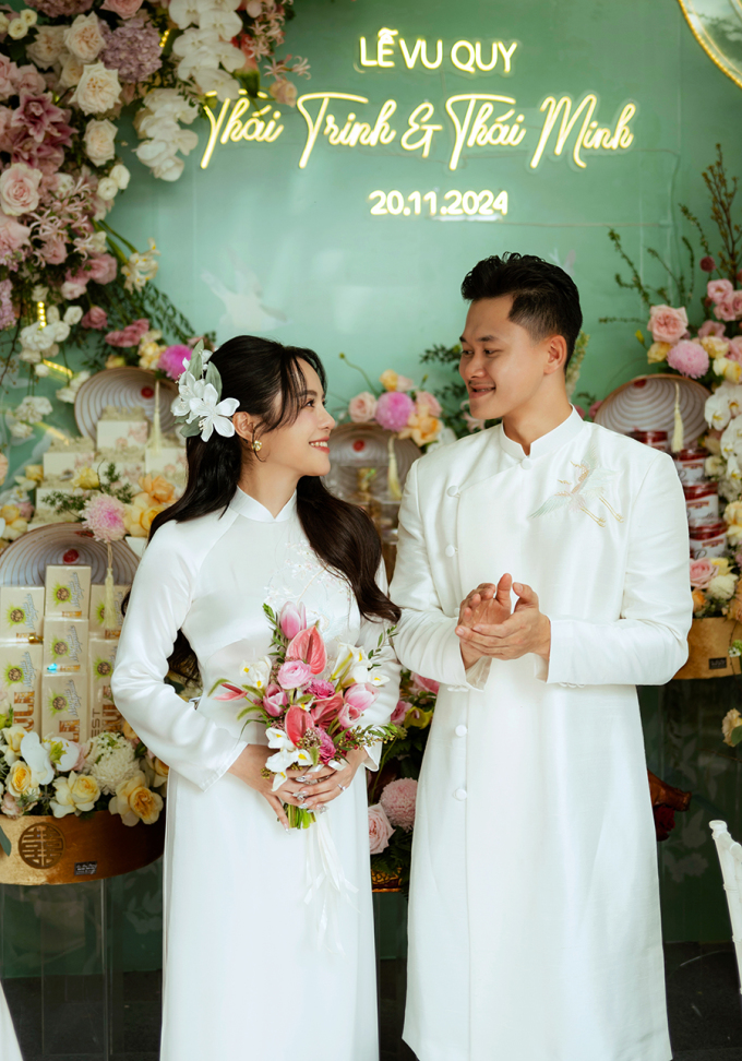 Hơn 2.000 đóa hồng cùng nhiều loài hoa như lan hồ điệp,phi yến,bỉ ngạn,tulip,cát tường,được dùng để trang trí cho lễ gia tiên của Thái Trinh. Gần 100 lồng đèn trắng cùng hệ thống đèn trang trí fairy light tô điểm cho không gian thêm màu sắc.
