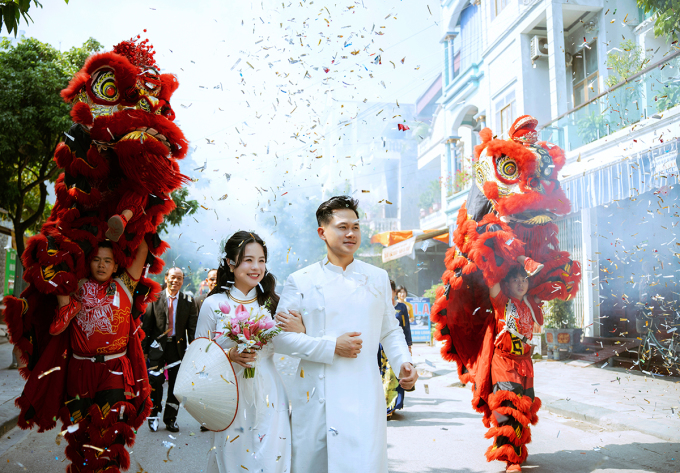 Cặp uyên ương diện áo dài,thực hiện nghi thức cưới truyền thống trước sự chứng kiến của gia đình hai họ cùng bạn bè,người thân.