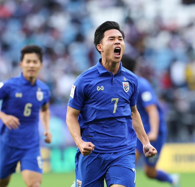Supachok Sarachat mừng bàn gỡ hòa 1-1 trong trận Thái Lan thua Uzbekistan 1-2 ở vòng 1/8 Asian Cup 2023. Ảnh: Xinhua