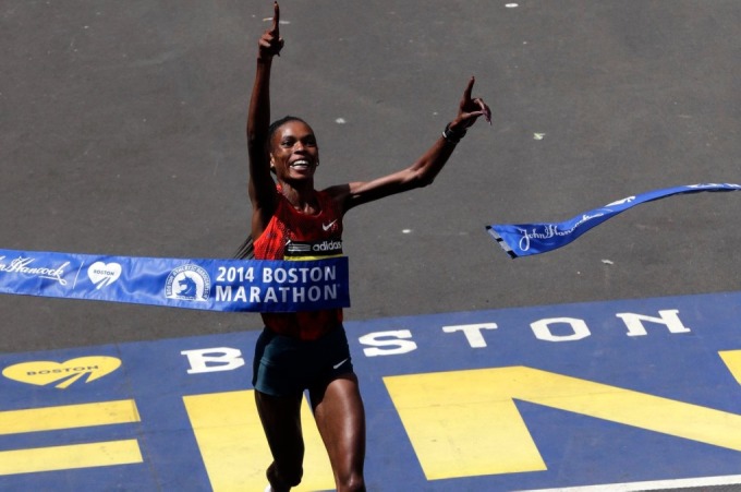 Jeptoo về nhất Boston Marathon 2014 với thành tích kỷ lục của giải,nhưng bị hủy kết quả vì doping,và từ chối trả lại món tiền thưởng đã nhận từ BAA cho chiến tích này. Ảnh: Boston Globe