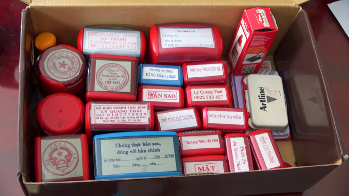 Nhiều con dấu giả "thiếu tướng,trung tướng,tổng cục trưởng" Bộ Công an được tìm thấy tại nơi ở của Thái. Ảnh: Nam An
