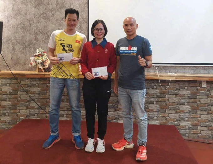 Anh Tiến (bìa trái),chị Thùy (giữa) nhận thưởng từ CLB sau khi phá kỷ lục trong 24 giờ của Việt Nam. Ảnh: VKL Runners