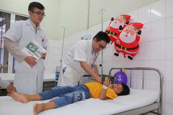 Bé trai được bác sĩ thăm khám trước lúc xuất viện. Ảnh: Lan Hương