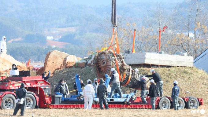 Sử dụng một chiếc cần cẩu lớn màu vàng,giới chức Hàn Quốc chiều 3/1 bắt đầu nhấc phần đuôi cháy sém và các bộ phận khác của máy bay,trong đó có động cơ,lên khỏi mặt đất để phục vụ công tác điều tra và tìm kiếm thi thể nạn nhân.