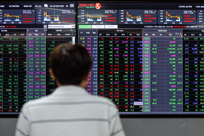 Nhà đầu tư đang quan sát bảng điện trong một phiên chứng khoán biến động vào tháng 10/2024. Ảnh: An Khương