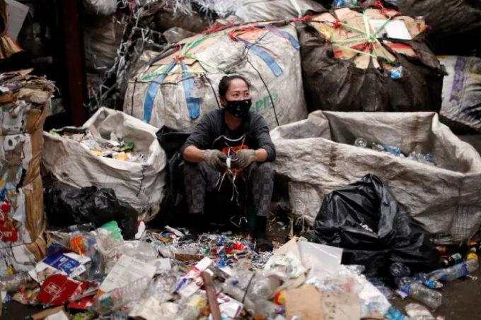Một người phụ nữ tại nhà máy tái chế ở Bangkok,Thái Lan,ngày 11/5/2020. Ảnh: Reuters
