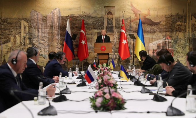 Tổng thống Thổ Nhĩ Kỳ Tayyip Erdogan phát biểu trước khi hai phái đoàn Nga và Ukraine đàm phán tại Istanbul tháng 3/2022. Ảnh: AFP