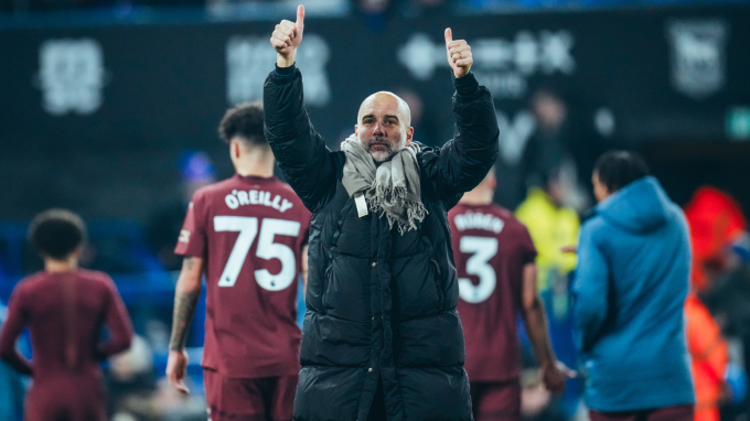 HLV Pep Guardiola tri ân người hâm mộ sau trận Man City thắng Ipswich Town 6-0 trên sân Portman Road,Ipswich,Anh ngày 19/1. Ảnh: Man City FC