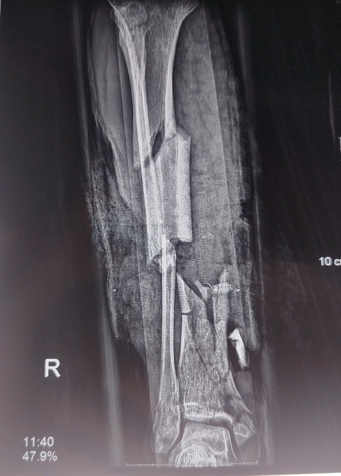 Do tổn thương nặng,bệnh nhân phải phẫu thuật cắt cụt 1/3 cẳng chân phải,sửa mỏm cụt ngón tay 4 và 5,đồng thời xử lý vết thương bàn tay hai bên.