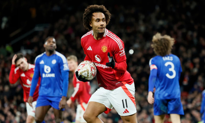 Joshua Zirkzee mừng bàn quân bình tỷ số trong trận Man Utd thắng Leicester 2-1 ở vòng bốn Cup FA. Ảnh: Apl
