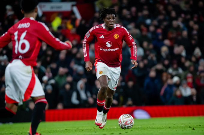 Patrick Dorgu đi bóng trong trận ra mắt thắng Leicester. Ảnh: Man Utd