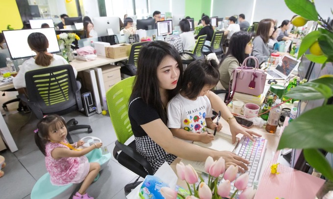 Một phụ nữ Trung Quốc vừa làm việc vừa trông con ở văn phòng. Ảnh: VCG