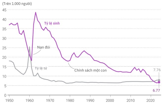 Tỷ lệ sinh và tỷ lệ tử của Trung Quốc trên 1.000 dân giai đoạn 1950-2024. Theo LSEG,Reuters