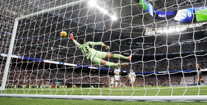 ... găm bóng vào góc cao phía xa khung thành,khiến thủ môn Gazzaniga không thể với tới,trong trận Real thắng Girona 2-0 ở vòng 25 La Liga trên sân Bernabeu,Madrid ngày 23/2. Ảnh: APS & AS