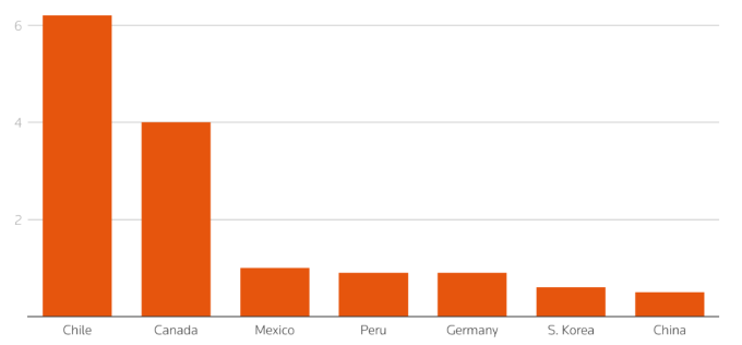 Trung Quốc hiện là nguồn cung cấp đồng lớn thứ 7 cho Mỹ. Dẫn đầu là Chile,Canada và Mexico.